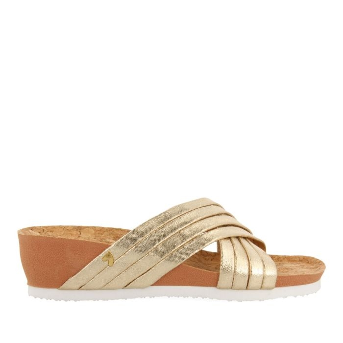 Chanclas tipo BIO con cuña y tiras cruzadas en color dorado. Planta suave y anatómica de microfibra. Piso muy ligero. ¡No te las querrás quitar!