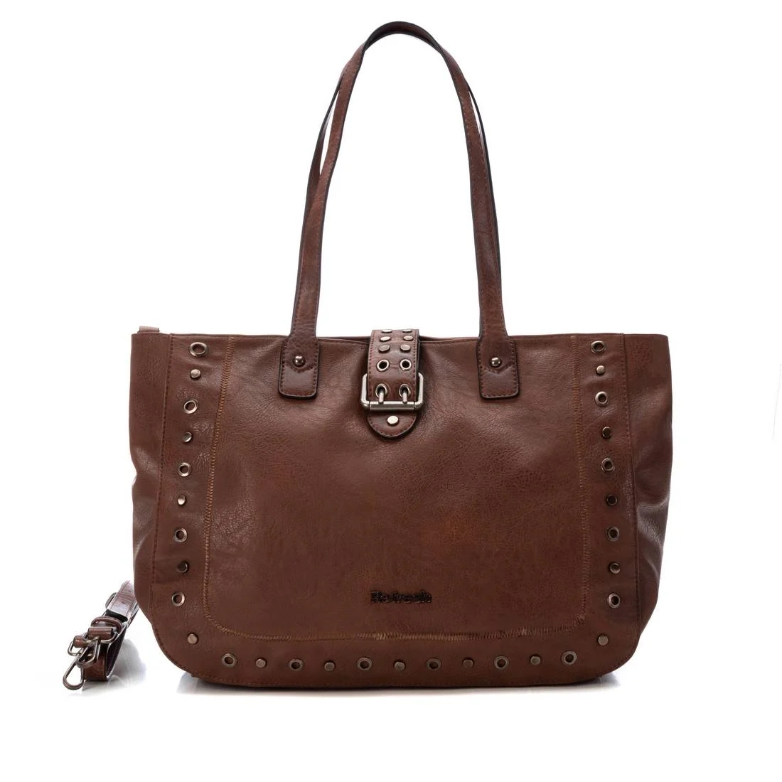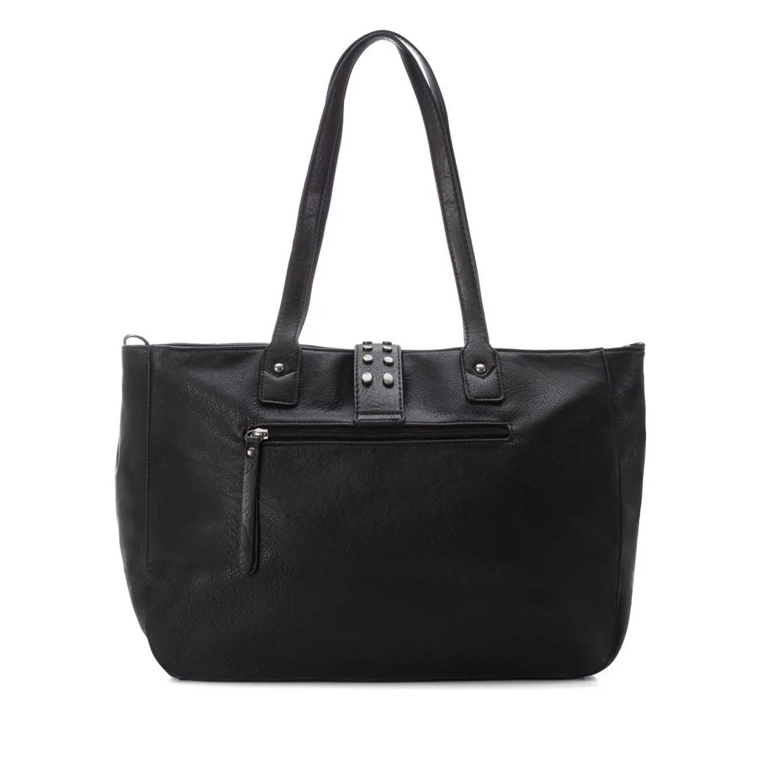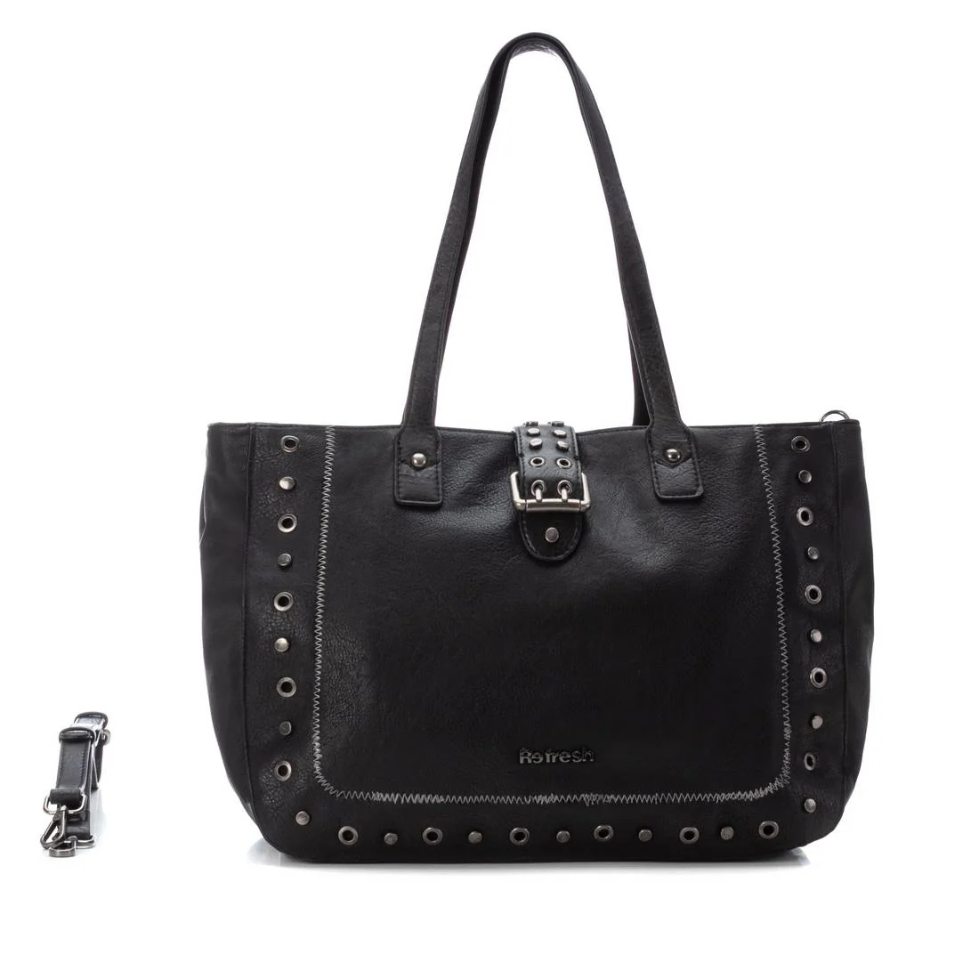 Bolso de hombro grande de la marca Refresh. Fabricado en un suave material que imita la piel. Decorado con tachas convierten al modelo en un bolso en tendencia. Con 4 bolsillos y cierre cremallera para que tus pertenencias queden guardadas. 28x42x15cm
