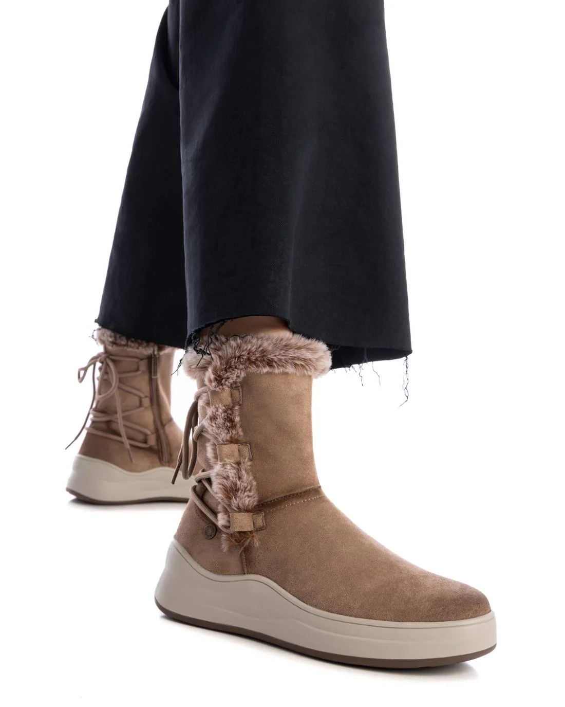 Botín de mujer, de la marca Refresh. Fabricado en una suave antelina. Botín perfecto para los días más fríos, sin perder tu estilo. Cierre cremallera lateral con cordones ajustables traseros. Suela gruesa de goma antideslizante.