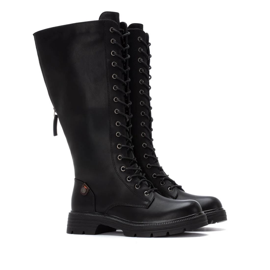Bota de mujer, de la marca Refresh. Fabricada en material que imita a la piel. Cierre mediante cremallera interior. Cordones tubulares regulables. Cremallera trasera que deja ver detalle con piedras pequeñas decorativas. Con gruesa suela de goma antideslizante. Con plantilla extraíble. Este modelo ha obtenido el certificado vegano por la organización mundial PETA (Organización de los derechos de los animales).
