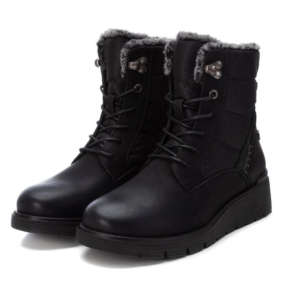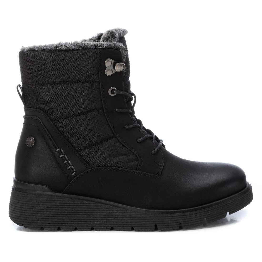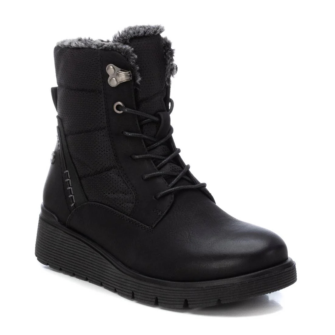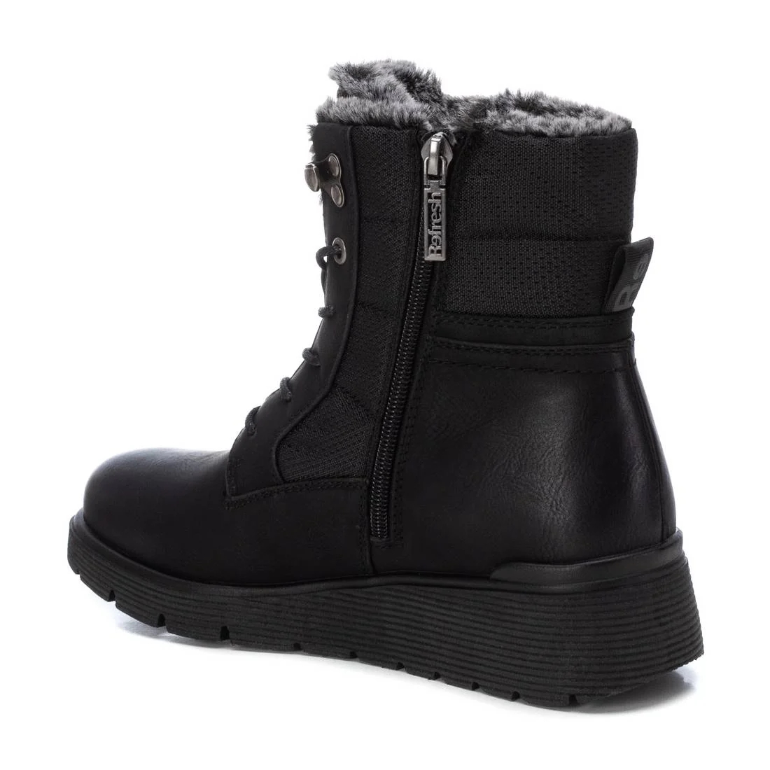 Botín de mujer, de la marca Refresh. Fabricado en un material que imita la piel combinado con diferentes Botín de mujer, de la marca Refresh. Fabricado en un material que imita la piel combinada con diferentes materiales. Cierre mediante cremallera lateral y cordones ajustables para mayor sujeción. Suela gruesa de goma antideslizante. Con pelito por dentro para los días más fríos del invierno. Este modelo ha obtenido el certificado vegano por la organización mundial PETA (Organización de los derechos de los animales).