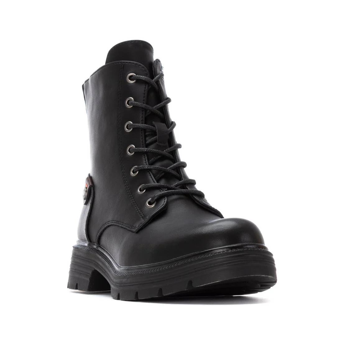Botín de mujer, de la marca Refresh. Fabricado en material que imita a la piel. Cremallera trasera que deja ver detalle con piedras pequeñas decorativas. Cierre mediante cremallera interior. Cordones tubulares regulables. Gruesa suela de goma antideslizante. Con plantilla extraíble. Este modelo ha obtenido el certificado vegano por la organización mundial PETA (Organización de los derechos de los animales).