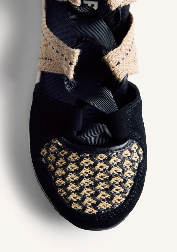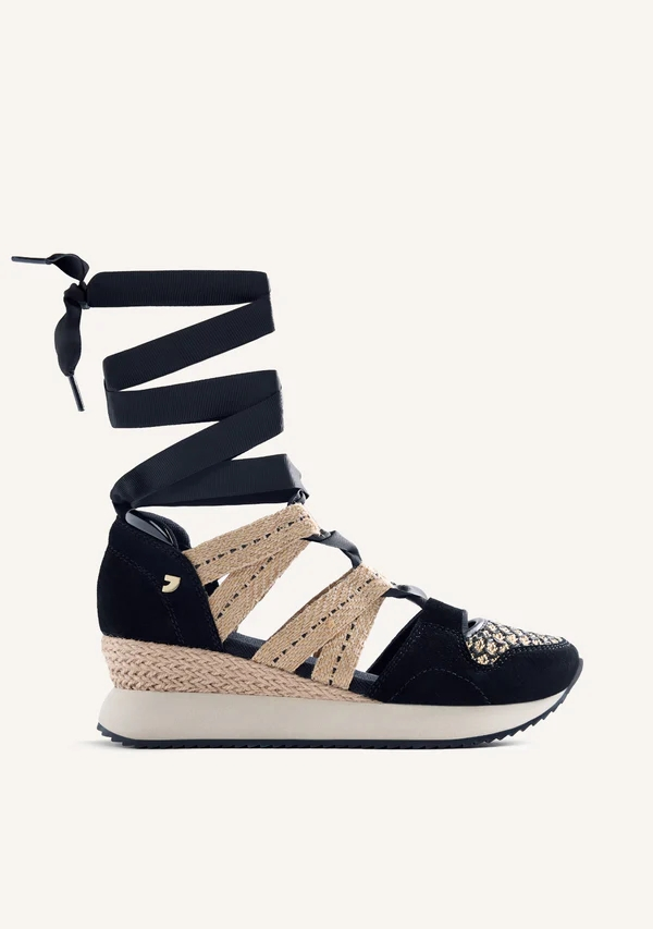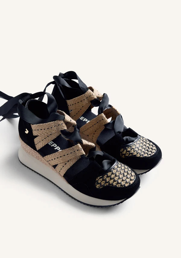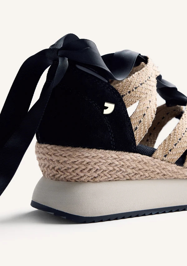 Zapatillas abiertas con piel serraje, rejilla y cuña forrada estilo rafia. Prespuntes decorativos. Cuentan con planta acolchada. Atadas con lazos. Altura cuña: 5,5 cm.