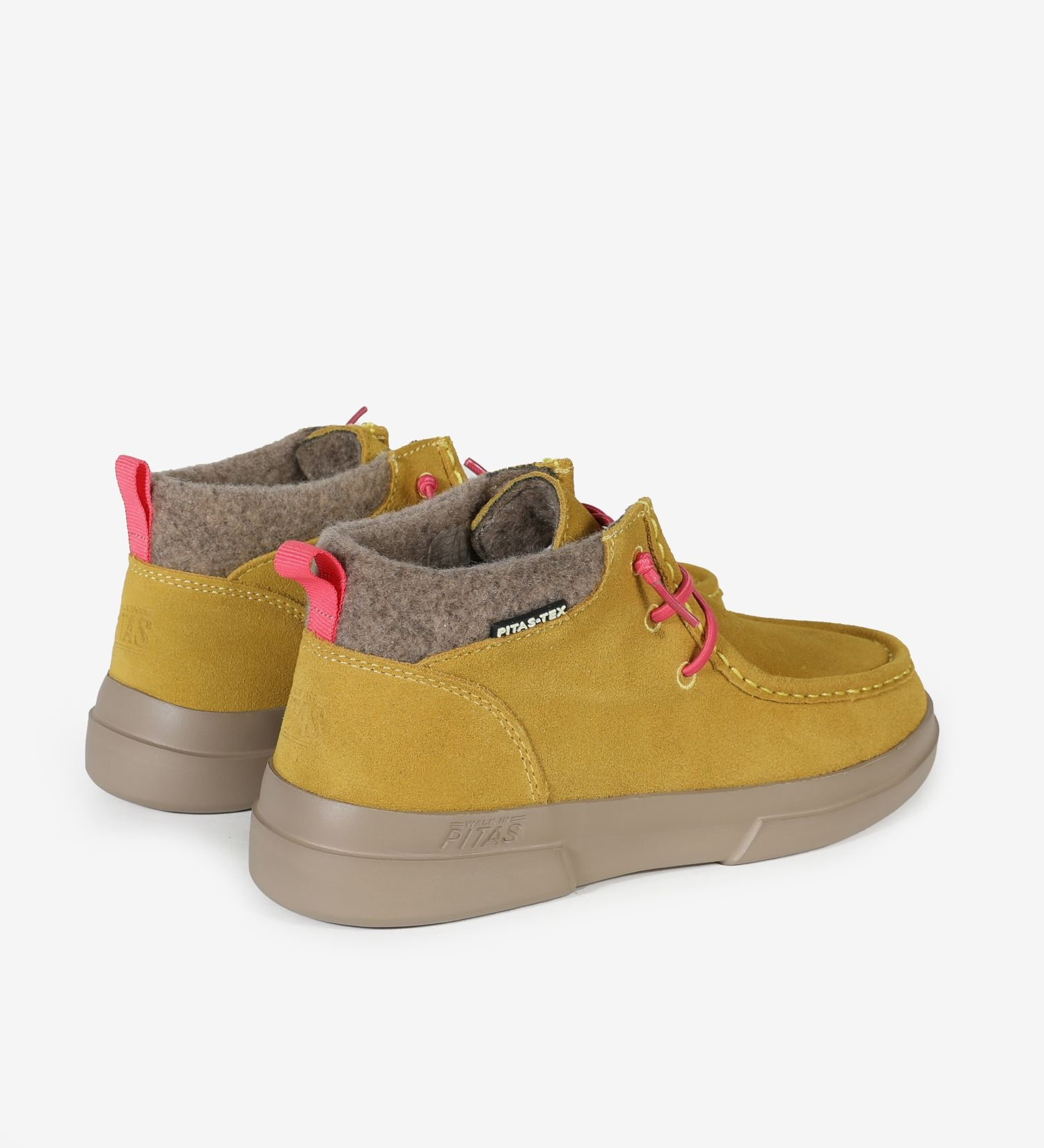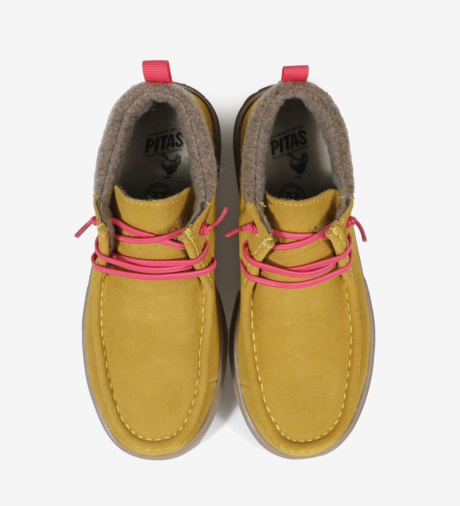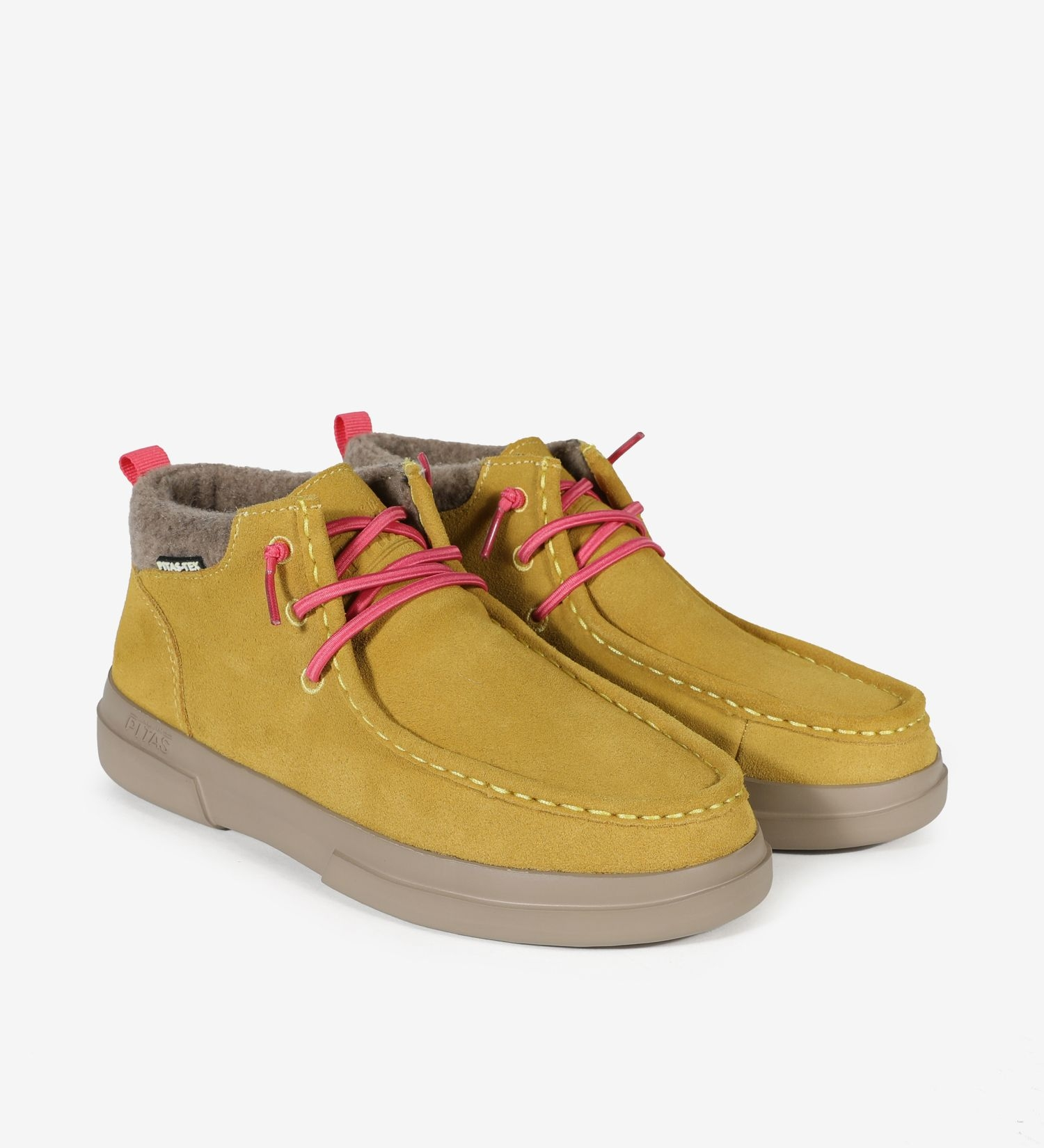 RECOMENDAMOS PEDIR UNA TALLA MÁS DE LA HABITUAL Bota urbana de corte wallabi para mujer. Fabricada en serraje y con cordones elásticos, está construída sobre la nueva suela PIC. Es ligera, flexible y muy cómoda.