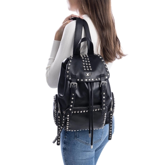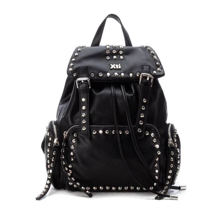 Mochila de la marca Xti. Fabricado en un material que imita la piel, decorado con tachas. Bolsillos exteriores con cremallera. Una mochila que podrás combinar con tus looks más casual. Solapa con botón y cierre mediante cordón trenzado para mayor facilidad de cierre. Modelo de mochila funcional y práctico.