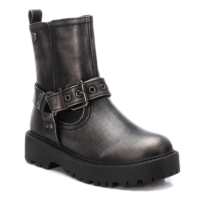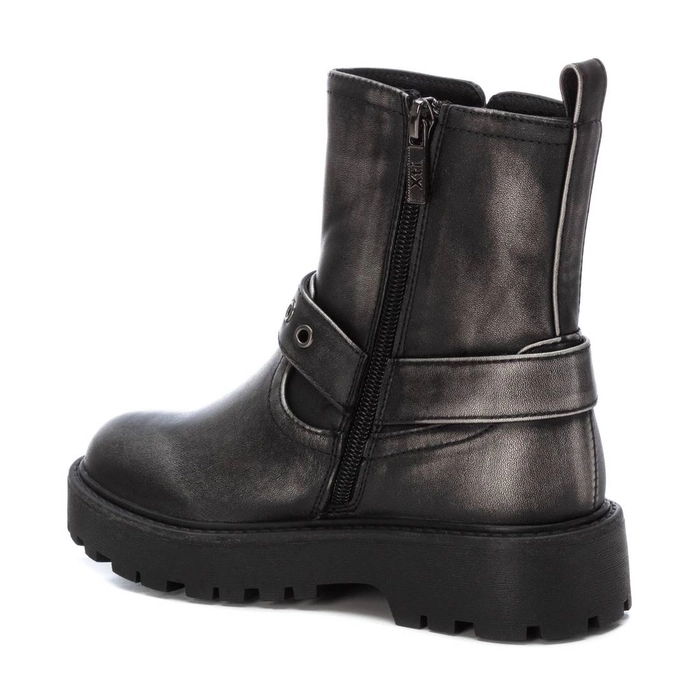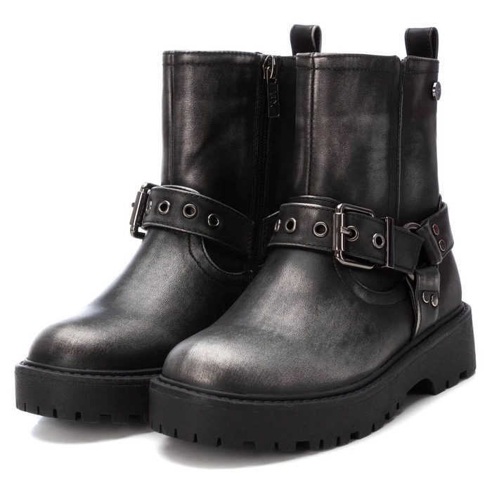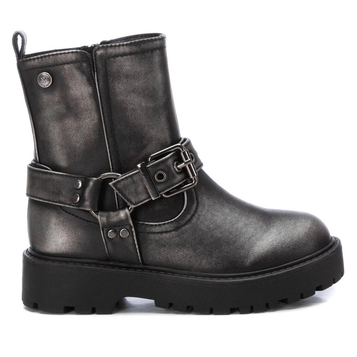 Botín de niña, de la marca Xti Kids. Fabricada en material que imita a la piel con acabado cepillado. Cierre mediante cremallera interior con tirador trasero para facilitar el calce. Hebillas metalizadas con acabado plomo. Botín casual para todos los planes, con gruesa suela de goma antideslizante. Este modelo ha obtenido el certificado vegano por la organización mundial PETA (Organización de los derechos de los animales).