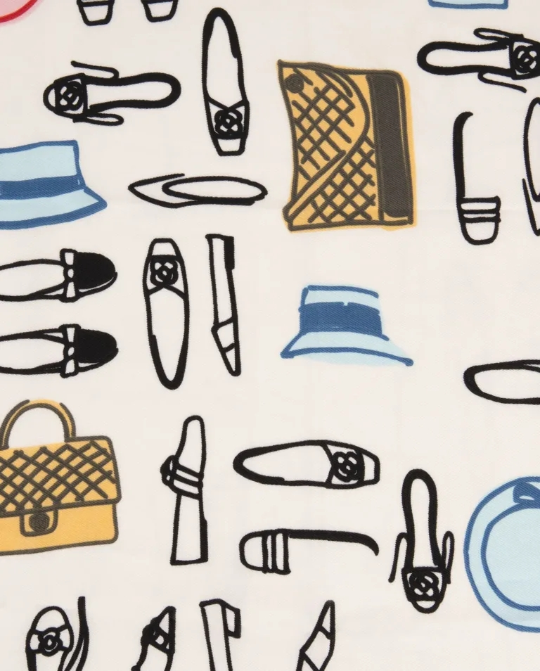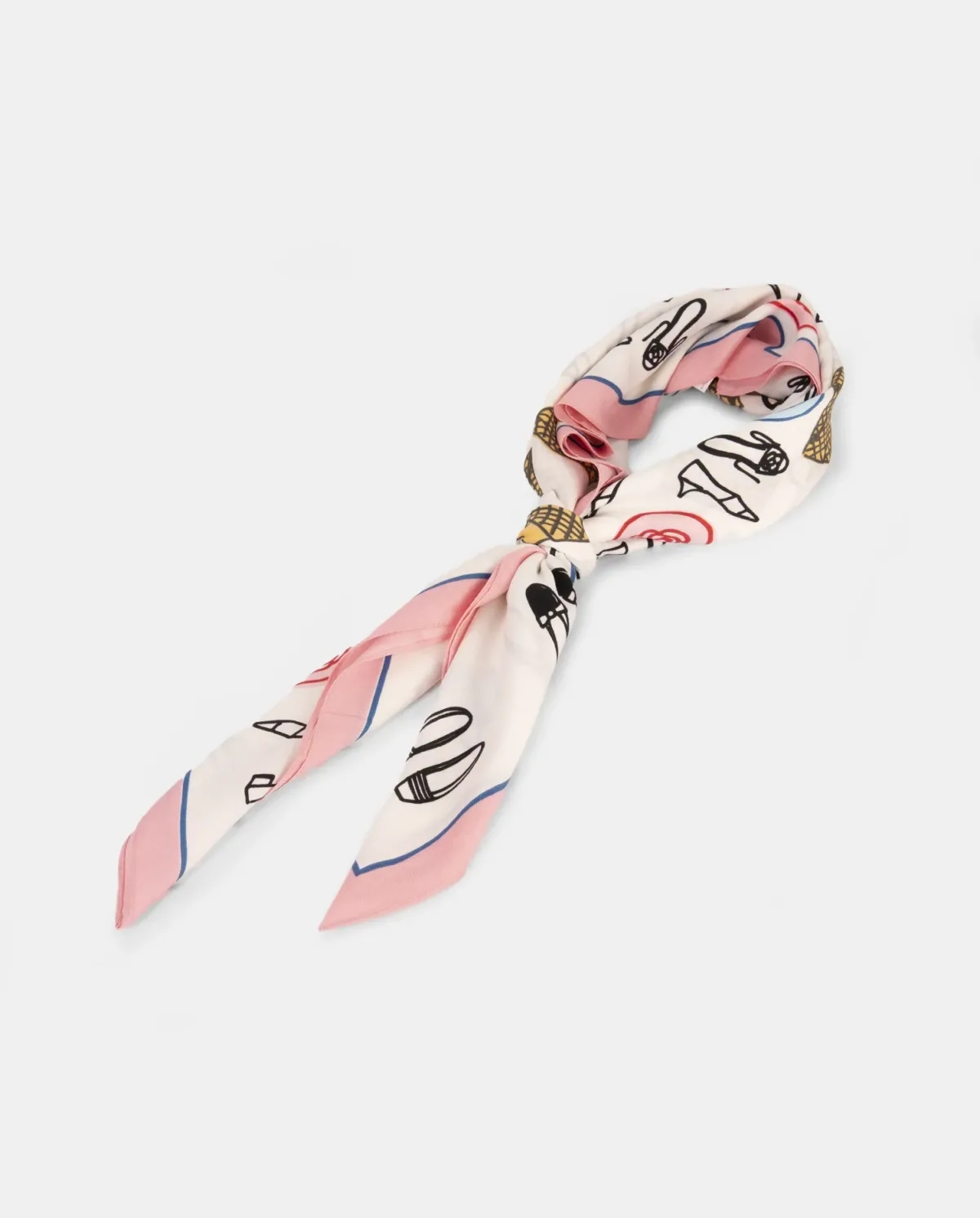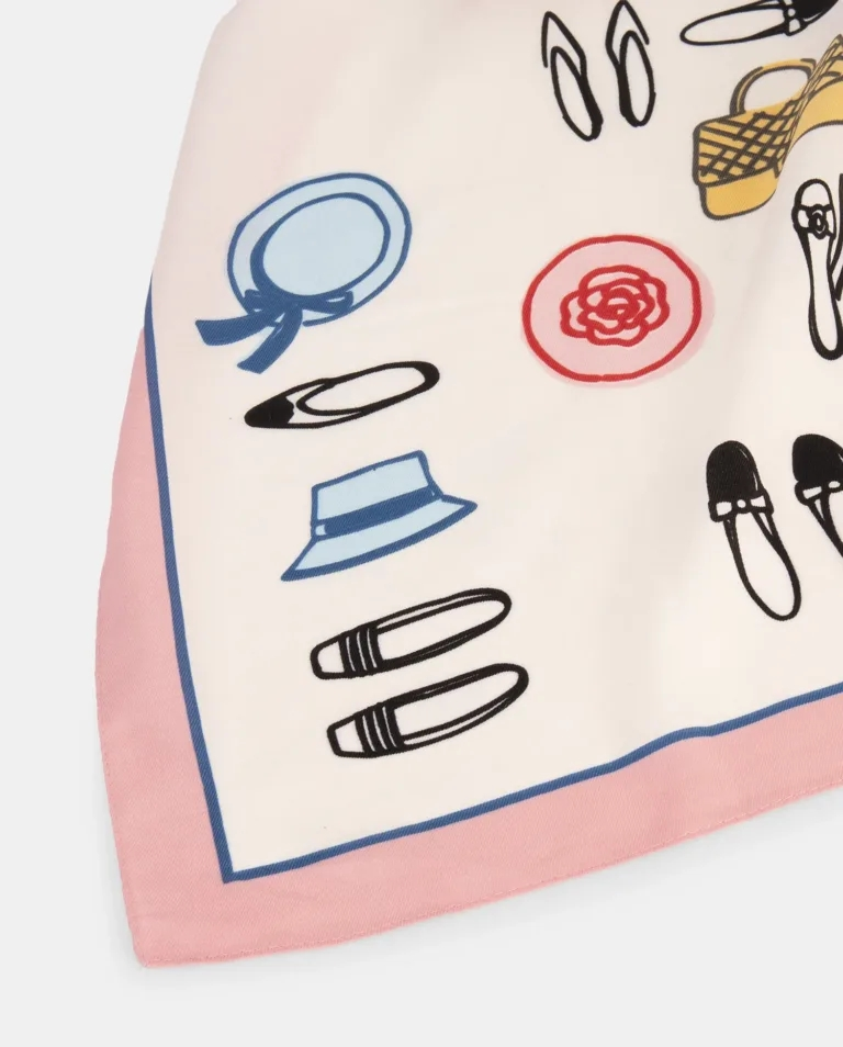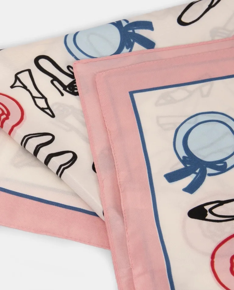 El pañuelo 251808 de Pepe Moll es el complemento perfecto para quienes buscan un accesorio versátil y con estilo. Con un delicado fondo blanco adornado con ilustraciones de sombreros, bolsos y zapatos en tonos pastel y un elegante borde rosa, este pañuelo añade un toque femenino y sofisticado a cualquier outfit.