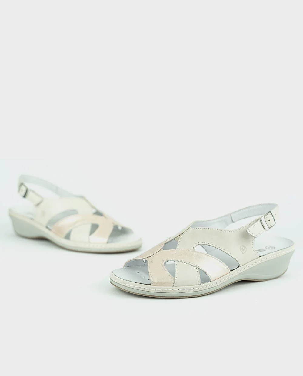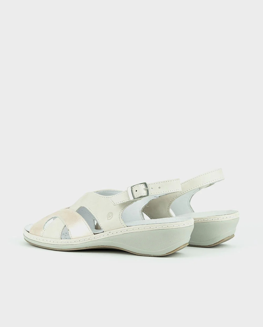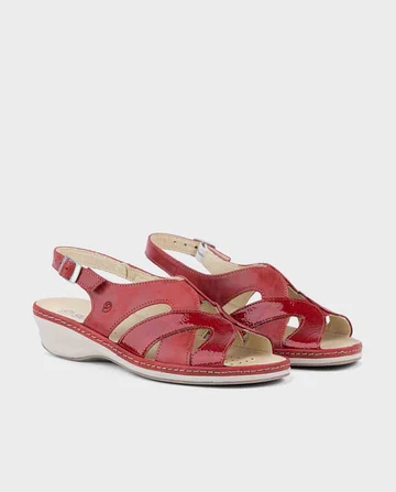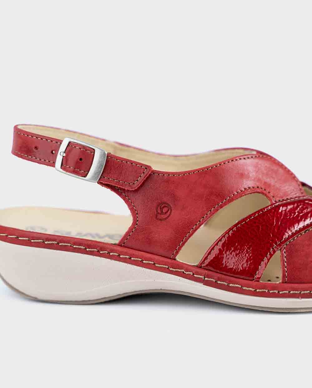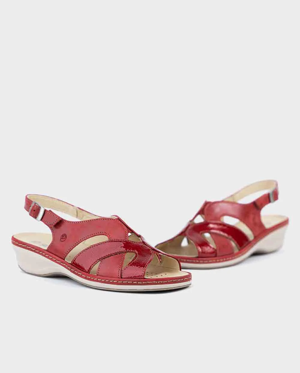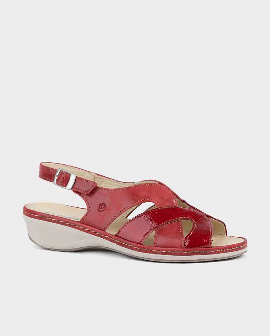 Sandalia de tiras con hebilla en talón, en combinación con piel natural blanco roto y charol beige o piel natural rojo y charol rojo.. Plantilla extraíble, anatómica y lavable en piel. Piso París con una altura aprox. de 3’5 cms.