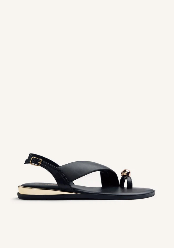 Sandalias planas de piel con cerco metalizado en acabado oro. Anillo con joya. Cuentan con planta acolchada y cierres ajustables en el tobillo.