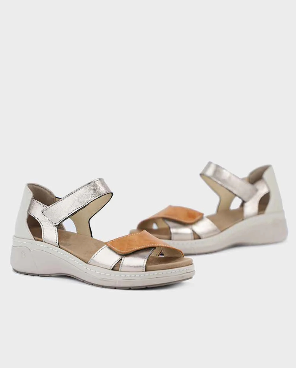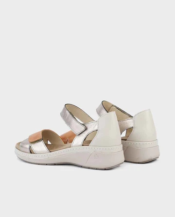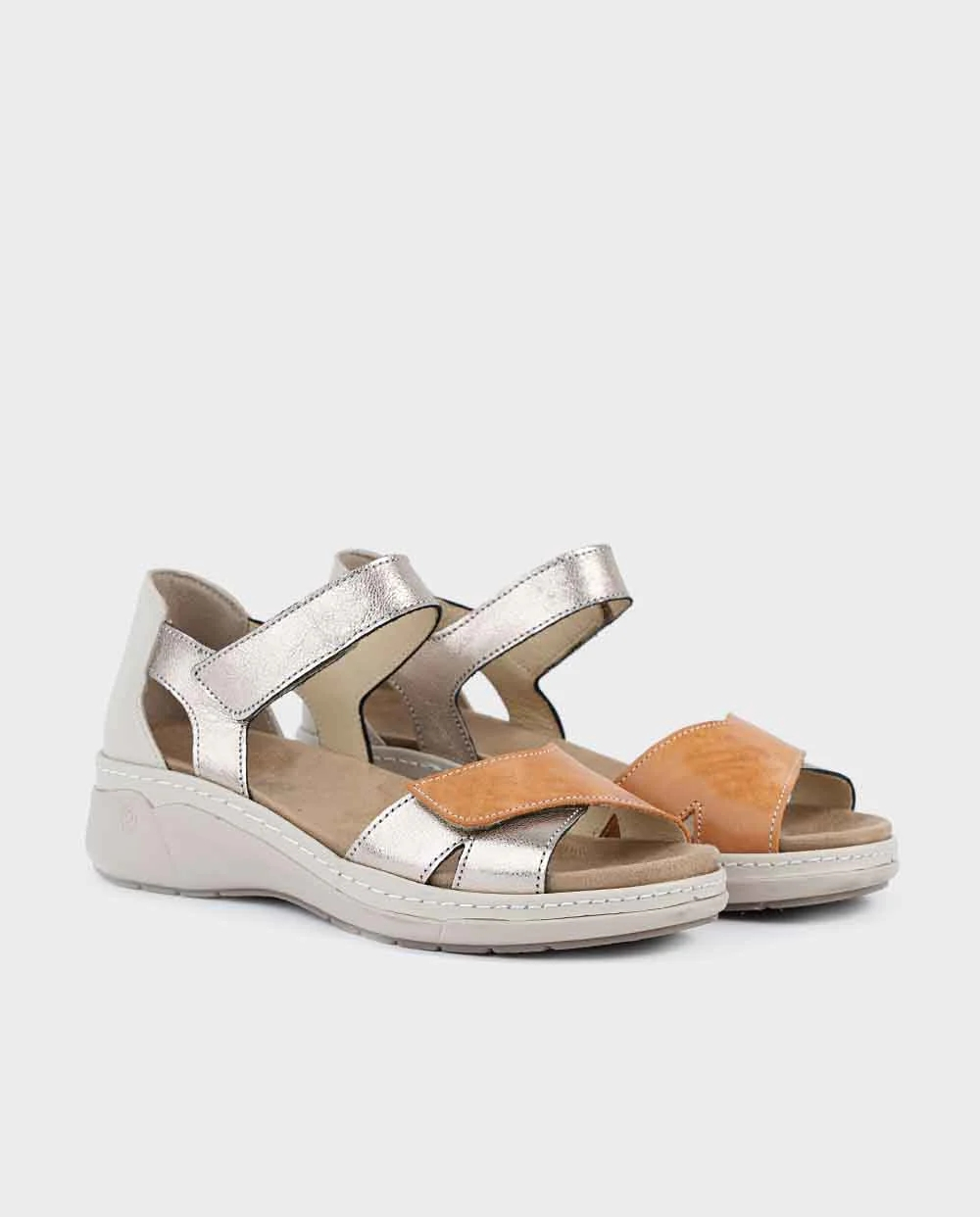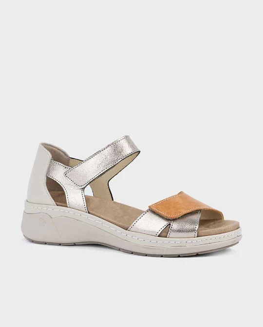 Sandalia doble velcro delantero y empeine. En combinación piel natural blanco roto, naranja  y metalizado plata. Plantilla extraíble, anatómica y lavable en piel. Piso Azores con una altura aprox. de 4’5 cms.